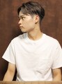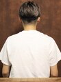 アウトラインをツーブロックで短く刈り上げトップに長さを残したセンターパートショートです。カラーはブリーチで一度色を抜いてからグレージュの色味を被せた外国人風カラーです。