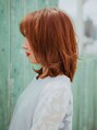 結べる長さの鎖骨レングスでレイヤーを入れてひし形シルエットに!!カラーは明るめのオレンジ系でツヤ感と軽さを出しています。前髪は薄めにして抜け感を◎レイヤーを短めに多めに入れているので動きがとても出るスタイルです!