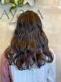 やや前上がりのセミロング。全体をコテで波ウェーブを作り、表面すこしだけランダムに巻いて崩しました。