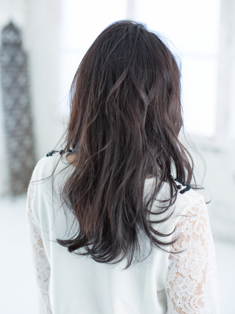 伸ばしかけの方にもおすすめなリラックスウェーブ。あまり段差をつけずに毛先に少しの軽さをつけたセミロング。伸ばしていくのに形が崩れにくいスタイルにしてあります。パーマでボリュームが出すぎないように表面に動きと軽さがでるように調節しています