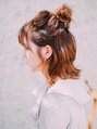 顔周りの後れ毛を残し上半分より少し少ないくらいの量を分けとり結びます。結んだ毛先をお団子にして毛先をお団子に巻きつけます。あとはバランスをみて、細い毛束を引き出したり、お団子を崩します。前髪も巻いてスタイリング