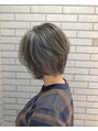 襟足を短めに切って、軽さを出す為にトップにレイヤーをいれたショートボブ。カラーはハイライト、ローライトをランダムにいれた後にグレージュで。