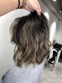 ハイライトを繰り返して作り上げたグラデーションカラーです。根元の方は地毛の暗さを残すことでコントラストが出てお洒落です。前下がりボブにレイヤーをつけ、ラフに巻くことで外国人の様な雰囲気に♪1度で近づけたい場合は3Dハイライトでご予約ください。