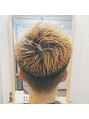 トップに少し長さを残してフロント側に毛流れをつけた、アップバングのフェードスタイル