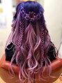 カラーは全体ブリーチした後カラーバターで、根元は濃い紫、毛先は薄いピンクにしています。