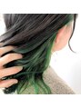 前髪にもインナーカラーを入れたのがポイント◎表面は暗めのマットアッシュ♪相性バッチリ!グリーンにイエローを少し混ぜた絶妙な調合で可愛いスプリンググリーン★