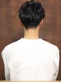 ベースは襟足とサイド短めのマッシュショート。トップにはレイヤーを多めに入れてゆるめにパーマをかけて立体感を出しています。耳上と襟足を短いツーブロックにしてあるので、全体的に長さはあるけどすっきり感のある印象になります。