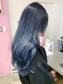ネイビーブルーです。ブリーチは2回必要です。根元は濃いめのグラデーションに仕上げるがいい感じです。顔周りにレイヤーを多めに入れてあげると動きがでるのでオススメです!