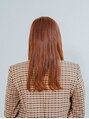 透け感のある明るめのオレンジカラーでツヤっぽく見せました。 全体はワンレンベースで顔まわりに少しだけレイヤーを入れてカットします。バングはシャギーを入れて斜めに流せるようにカットします。