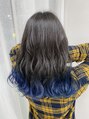 グレージュからのビビットブルーへのテールカラー!!根元は、赤みも黄みも消したダークグレージュで染めているため派手すぎないグレージュになり毛先は、カラー剤で作ったブルーになっているので色持ちも抜群のオススメカラーです。