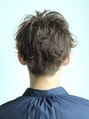 前髪を長めに残したショートレイヤーに毛先がハネるようなピンパーマをかけて無造作な動きをつけたスタイルです。トップは根元が立ち上がるようにボディパーマをかけ、毛先はピンパーマで外ハネになるように巻いています。