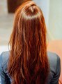 胸下でカットしたロングスタイル。重たい印象になりがちなバングが長いロングスタイルも顔まわりを少し軽くして肌を透けさせることで顔が明るくなります。スタイリングは太めのコテで耳から下だけどをゆるく巻いています。