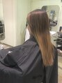 ハイライトをプラスして透け感のあるカラーに♪長さは10センチほどカットし、前髪を作りました。もともとブリーチ毛なので、パーマではなくアイロン仕上げにしました。