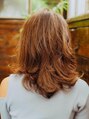 m動きのあるミディアムスタイル!スタイルとしては重め系ですが全体にカールで動きを出しているのでふんわりとした雰囲気になります!ランダムにカールすることでさらに動きが加わるので明るくなりミディアムからロングになりかけにおすすめ!