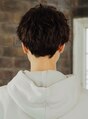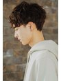サイドを刈り上げたツーブロック。オーバーはソフトツイストでランダムな動きをつけています。少しウェットな仕上がりにすることでワイルドな印象になります。サイドパートやセンターパートなどスタイリングで印象に変化をつけられます。