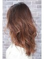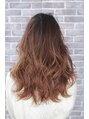 柔らかく大きなウエーブが可愛いセミロングスタイルです。肩に当たってラフに動いても雰囲気の出るふんわりスタイルです。
