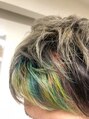 全体ブリーチ後に、アンダーと根本はダークグレーで沈め毛先はグレージュにしました。前神はクリエイティブ用にカラフルに。
