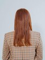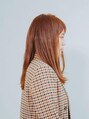透け感のある明るめのオレンジカラーでツヤっぽく見せました。 全体はワンレンベースで顔まわりに少しだけレイヤーを入れてカットします。バングはシャギーを入れて斜めに流せるようにカットします。