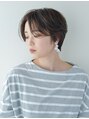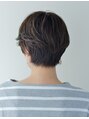 女性らしさが残るハンサムショートスタイルです。サイドは、耳下に設定。襟足は、首に沿う長さを残します。前髪は、目の下の長さでセンターパートにカット。パーマは、毛先ワンカールかけて柔らかなニュアンスに!カラーは、アッシュベージュをセレクト!