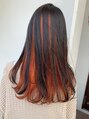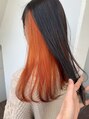 上は暗めのグレージュで、インナーは鮮やかなオレンジを入れました!オレンジはワンブリーチでいけるのでオススメですよ!このカラーにしたい方は是非ご指名下さい!!学割U24 ダブルカラー ハイトーン インナーカラー ブリーチ