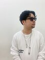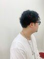 センターパートの大きめカールのパーマスタイルくっきりカールを出してウエットな質感にすれば、メガネにもよく合うオシャレなパーマスタイルに。