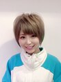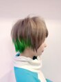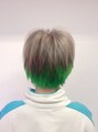 ショートカット部のコウトウマリアさんです。カットは後ろを少しツーブロックにして、揃えるくらいに切って、ブリーチはリタッチ中心に軽く毛先まで染めて、インナーを少し蛍光のグリーンに全体は少し濃いめのシナモンベージュにしました。