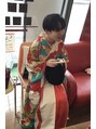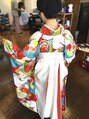卒業式袴着付け・少し変わった着物・袴のチョイスにお客様のセンスと感性を感じます。個性的な着物にベレー帽で卒業式おめでとうとございます。