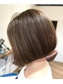 年代問わず人気の前下がりボブ♪骨格、髪質、クセをしっかりと見極めてその方に似合うバランスのスタイルをご提供。カラーはグレイカラーでも明るく、トップにハイライトで動きをプラス。ハンドブローで簡単に仕上がるように丁寧にカットされています。