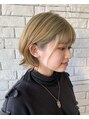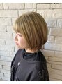 一度ブリーチをしてからグレージュ系のカラーを入れてます。ボブスタイルですが長めでレイヤーが入っているので、外ハネスタイルでより軽さと動きを出しています。