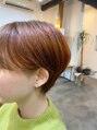 顔周りが前髪と繋がっていて短くすっきりしているショートスタイルに、表面のハイライトを活かしてシアーオレンジのカラーで仕上げました。