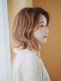 オレンジ味の強いカラーで肩につくくらいのミディアムにカットし、トップにボリュームを出すために少しレイヤーを入れたスタイル。毛先を外ハネにしウェーブが出るように波巻き。顔まわりを外巻きにすることで大人っぽく仕上げました。