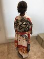 ヘアセットは全体的にウェーブを出し、下めにまとめた綺麗めスタイル!着付けは二輪のお花の帯アレンジ!