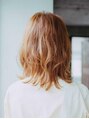 長めぱっつんボブのスタイルに表面、顔まわりにレイヤーが入った重軽なヘアスタイルです。前髪は目上ギリギリで少し流しています。カラーは明るめのオレンジベージュでツヤ感をプラス