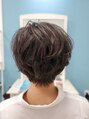 やや前下がりにカット。トップにレイヤーを入れてひし形シルエットに。前髪は目の上で隙間が出来るように斜めにカットし流れるようにしています。パーマをン元が立ち上がるようにかけて毛先に動きをプラスしました。【岡山】【倉敷】【白楽町】