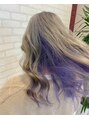 全体をブリーチしてから2セクションに分けてカラーリングをしてインナーカラーにしてあります!表面はグレー系で、インナーにはラベンダーカラーで染めています!