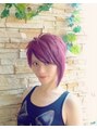 マンガに出てくるキャラのようなビビッドなイメージで造りました。インパクトのあるディープなピンクに自毛より黒い黒でローライトを配しました。左右も思い切ったアシンメトリーウルフカットで、向きによって表情が大きく変わります。/アシメウルフカット