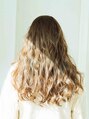 ギャルになりすぎない外国人のような透明感のあるベージュ系カラーです。 前髪はセンターパートで大人可愛い印象を作りました。パーマで作る強すぎないナチュラルなカール感がまた外国人のような質感を作ります。