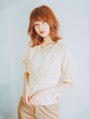 長めぱっつんボブのスタイルに表面、顔まわりにレイヤーが入った重軽なヘアスタイルです。前髪は目上ギリギリで少し流しています。カラーは明るめのオレンジベージュでツヤ感をプラス!全体をコテでゆるく巻き、崩します。ハイライト、髪質改善