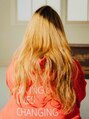 ブリーチのダブルカラー。根元は伸びてきてもくっきりと色が分かれないようにナチュラルに見えるようにカラーをします。バングはサイドパートで分けてかきあげ風にも見せられます。大きめのコテで巻くのがスタイリングのコツです!!