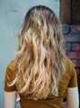 大流行のバレイヤージュで外国人風のカラーリングに!ベースとブリーチ部分のコントラストをしっかり目につけてスタイリングもハイライト部分をすくって上からウェーブを付けました。シアバターを適度につけウェット過ぎずドライ過ぎずな印象に!