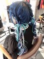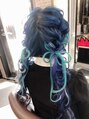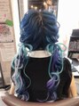 ブリーチ2回後ブルーカラーにしました。エクステで水色、パープルとシルバーメッシュで仕上げにふわ編み込みツインテールリボンセットしました。