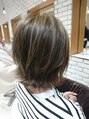 肩につかないボブに表面のみレイヤーを入れて、軽さと丸みを出しました。カラーは、オリーブベージュカラーにハイライトを入れて、立体感と束感を出してます。