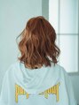 全体をコテで強めにまいたミディアムスタイル。またかきあげバングにすることでクールな雰囲気もでます。オレンジのカラーが印象的な大人ストリートスタイルです。