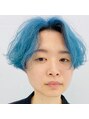 クセを生かしたワンレンショート。ライトブルーにフェイスラインは黒で引き締め。