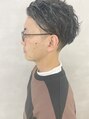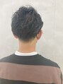 2ブロックのパーマスタイル。上は長めで大きめなパーマがかかっています。前髪をあげ、ジェルでカチッとしているので スタイリングがくずれにくいスタイルです。