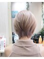 カットは、トップにボリュームを出し、襟足にくびれをつくり、襟足長めのショートウルフ♪カラーは、もともとブリーチが2回して2ヶ月経った状態から、さらにブリーチを1回して、ミルクティベージュ系で染めました。ピンクシャンプーを使えばキープ可能。