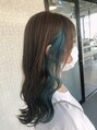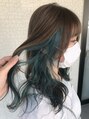 夏オススメのグリーンとグレー.ベージュをMIXしたミルキーベージュ髪質や髪の状態に合わせたオリジナル調合で赤味を抑えて透明感をさらに引き出してくれるカラーです!インナーのみワンブリーチをしてビビットなエメラルドグリーンをいれて可愛いカラーに!