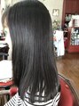 貴重な黒髪のロングヘアーですね。段(レイヤー)も梳き(セニング)も入れずシンプルなワンレングスです。