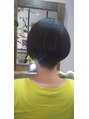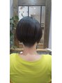 やや厚みを残し角を取った丸みのボブ感でネープの刈り上げと前下がりでクールに偏り過ぎないスタイルに。カラーはワンポイントでフロントに筋状のハきイトーンハイライト。