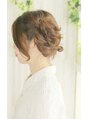 耳後ろにまとめたシニヨンが、女性らしいフェミンなシルエットのアレンジスタイル。